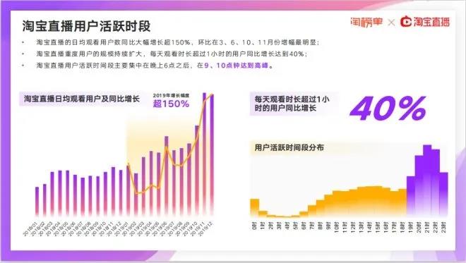 《報(bào)告》顯示,淘寶直播的日均觀看用戶數(shù)同比大幅增長(zhǎng)超150%,環(huán)比在3、6、10、11月份增幅最明顯;淘寶直播重度用戶的規(guī)模持續(xù)擴(kuò)大,每天觀看時(shí)長(zhǎng)超過(guò)1小時(shí)的用戶同比增長(zhǎng)達(dá)到40%。