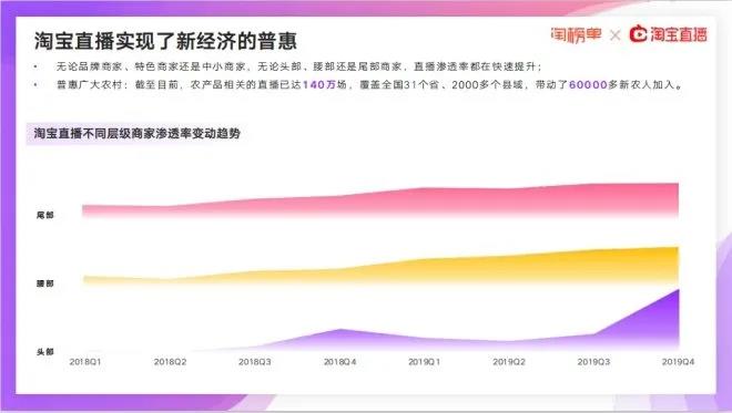 2019年末,淘寶直播在阿里巴巴電商平臺(tái)上的整體滲透率夫接近去年同期的兩倍。各行各業(yè)都在將直播作為商業(yè)的一個(gè)核心動(dòng)能,這一新經(jīng)濟(jì)業(yè)態(tài)已經(jīng)進(jìn)入成熟期。